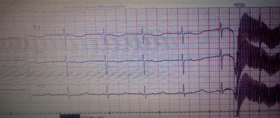 Initial chest radiography revealed increased pulmonary vascular markings. Ultrasound of the central nervous system showed no significant abnormality. ECG showed sinus bradycardia with a heart rate around 75 beats per minute, with second degree AV block, and slightly prolonged QT interval (QTc 467 ms) ( Fig.1). Urgent echocardiogram showed structurally normal heart with patent foramen ovale.