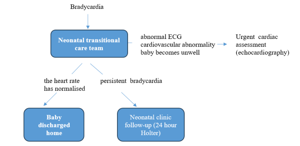 In our medical institution, every live-born child with bradycardia is first observed by neonatal transitional care team during the first two days after the birth, during which possible causes of bradycardia are investigated, ECG recording is conducted, testing results are waited for and, if necessary, various medical specialists are consulted.